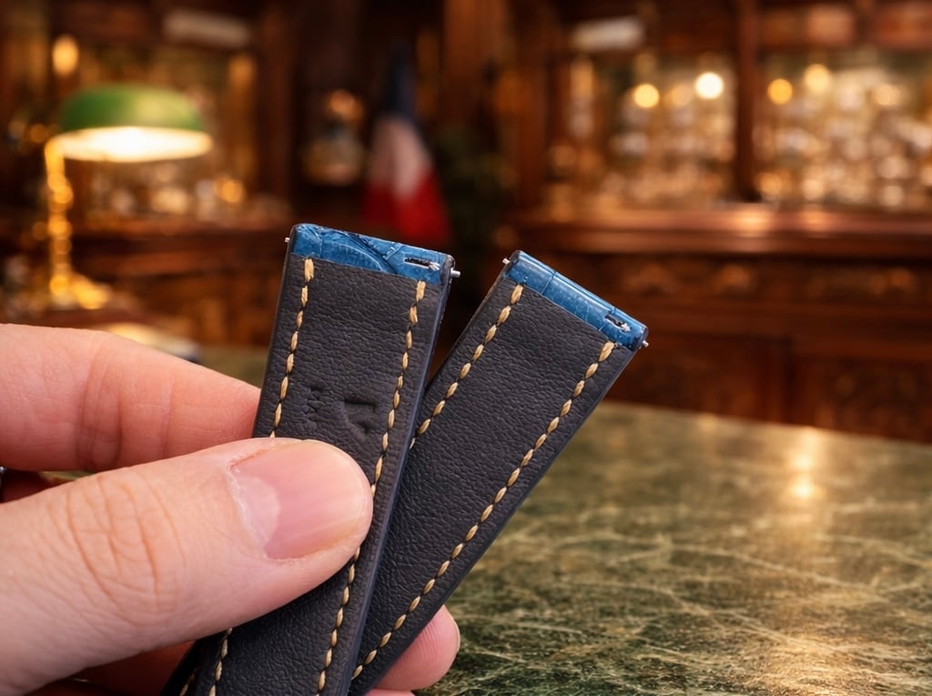時計ベルト / シャムクロコダイル・ネイビー竹腑・手縫い 18mm-16mm ボンベ形状 腕時計バンド ハンドメイド 時計ベルト交換 アンチスウェット裏材 ステンレスDバックル(プッシュ式バタフライバックル)付き ワンタッチバネ棒 クイックリリース装備 カスタムも可 オメガやタグホイヤーにも
