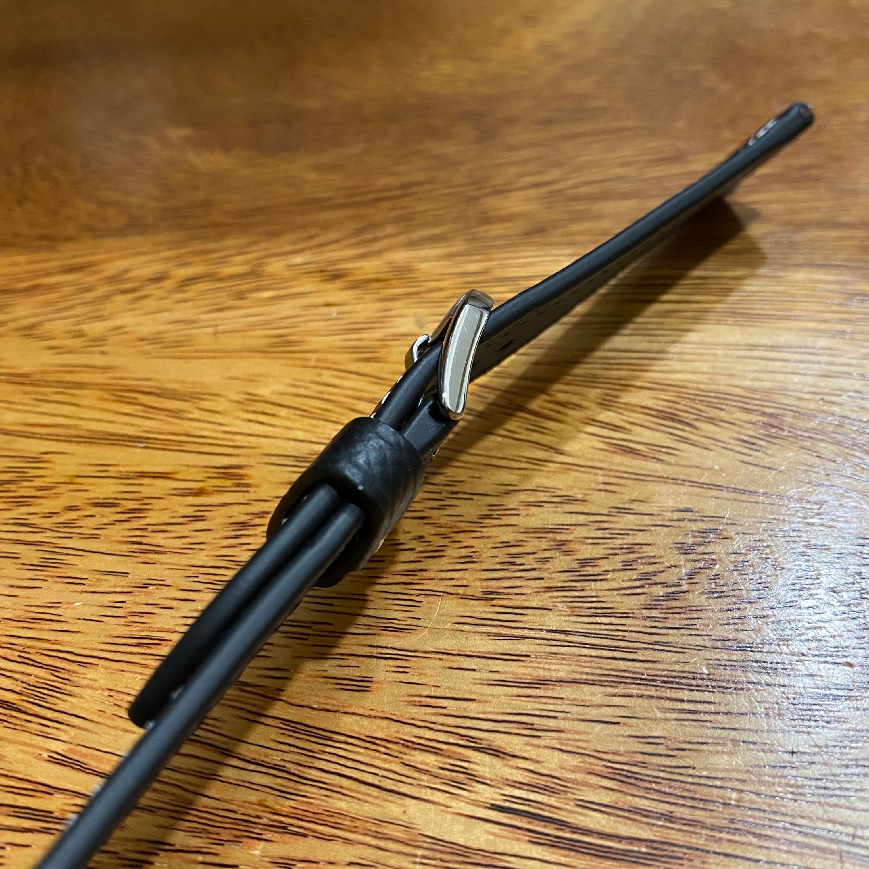 ・機械式時計用のベルト制作技術を採用し、胴元幅20mmから美錠幅16mmにかけて絞りを持たせた滑らかなテーパーをかけたシルエット。