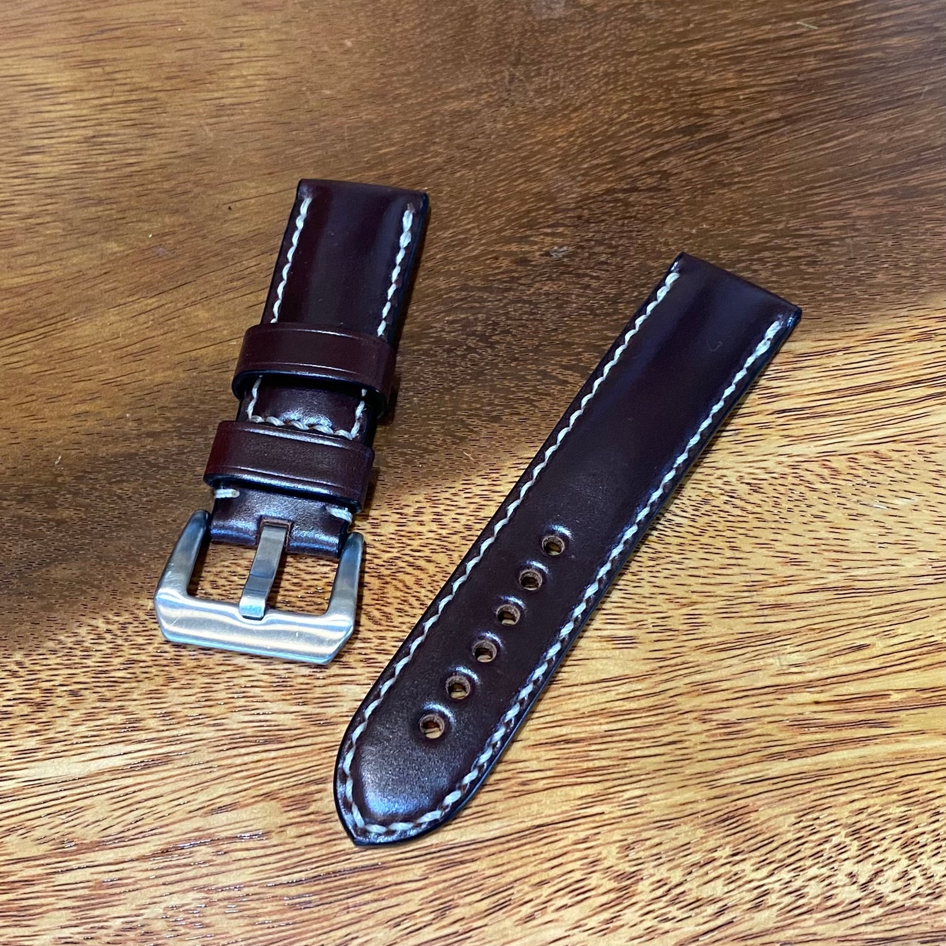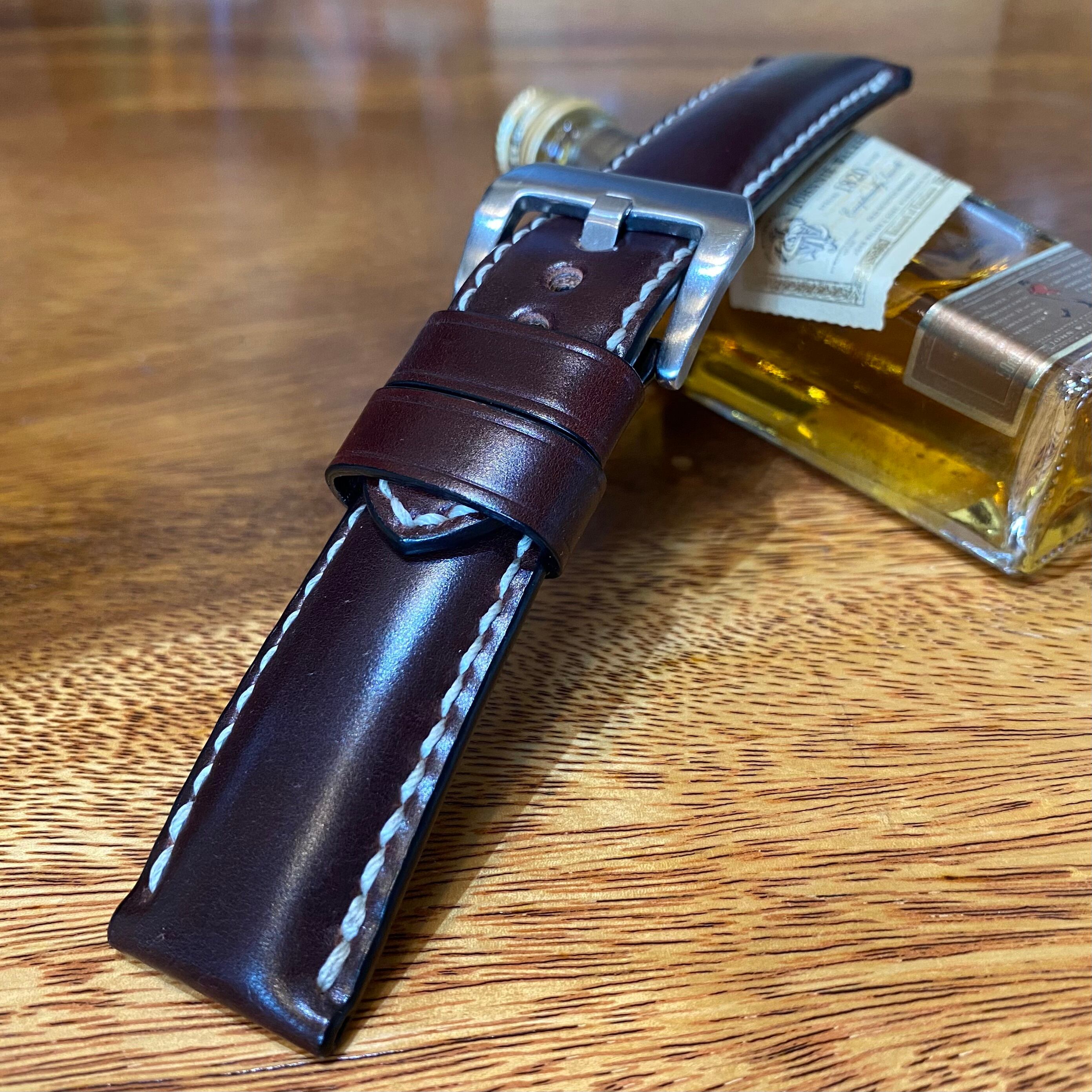 時計ベルト 24mm ストレート オイルコードバン・バーガンディ・甲丸 極太1番糸 手縫い 腕時計バンド