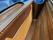 ・お札入れ、チケット&領収書入れ、カードポケットのそれぞれの口部には伸び止め、補強加工を適材適所で施しておりますので、薄く耐久性を持たせた作りこみとなっています。